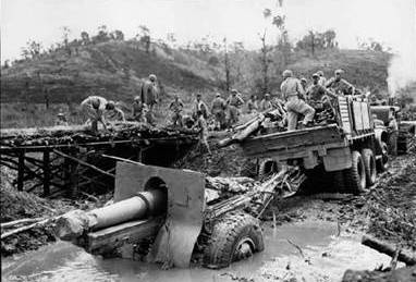 1945年2月15日,在緬甸臘戍以北55英裏處,第2炮兵連的一門155毫米榴彈炮陷入溪流,找來一台卡車拖拽。(美軍通信兵(U.S.Army Signal Corps)拍攝)
