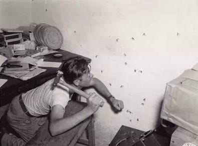 “嘩!”,還有另一個目標在牆上。加州的詹姆士·羅布農(JamesH.Lobnow)技術軍士手執釘錘,對一群侵入印度藍姆枷的“B-29”狠狠打擊,當“煙消雲散”的戰鬥結束後,發現牆上停歇著眾多“飛機殘骸”。“哦!真不少!這就是殘酷的戰爭!”恐怕隻能這樣感歎如此奇觀了。(凱佛茨(Keyfetz)參謀軍士(美軍通信兵(U.S.Army Signal Corps)拍攝)