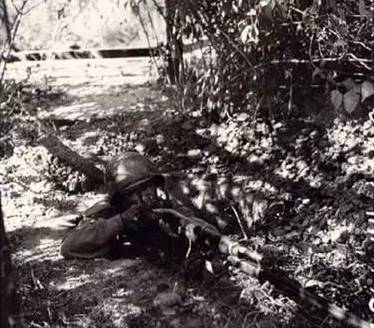巴莫,緬甸北部。中國衛兵在散兵坑中監視戰地邊界。這個戰士要確保敵人無法滲透防線,而日軍隻有一百碼遠。