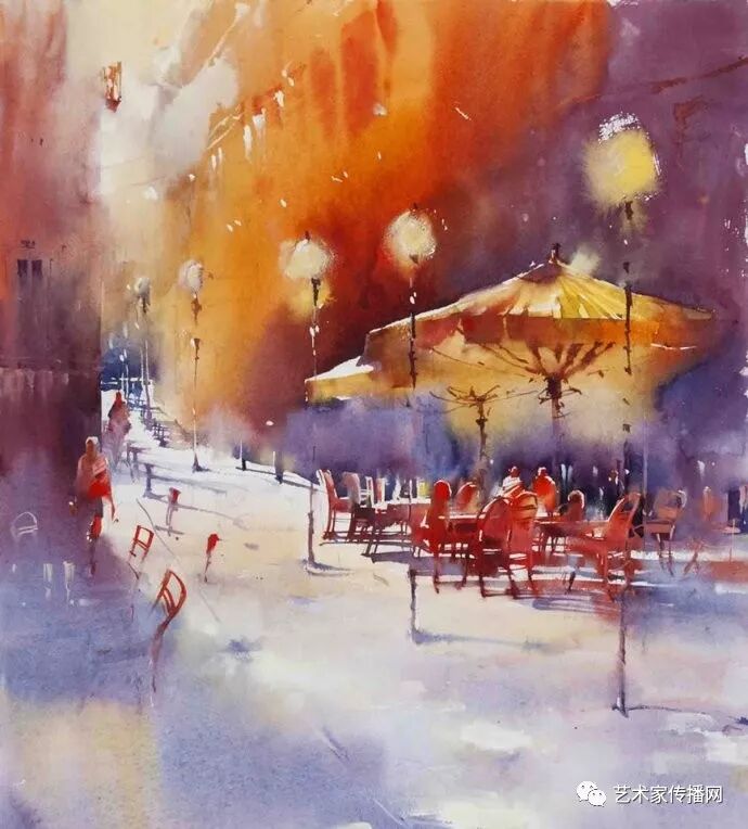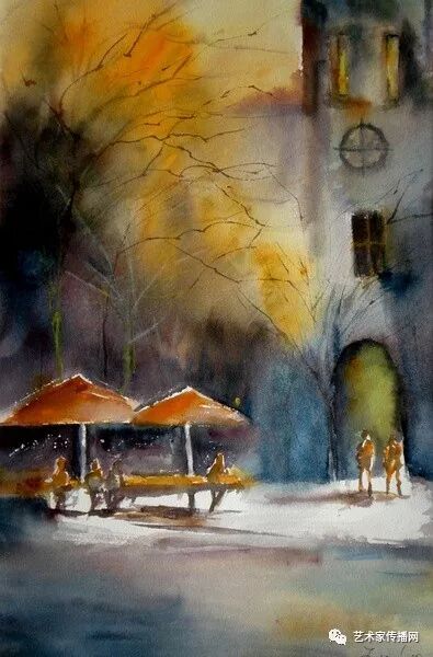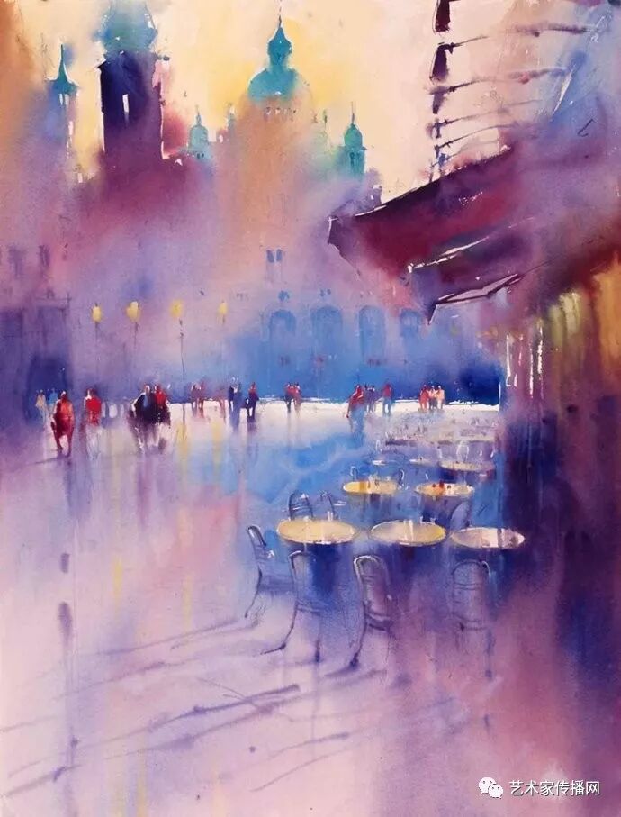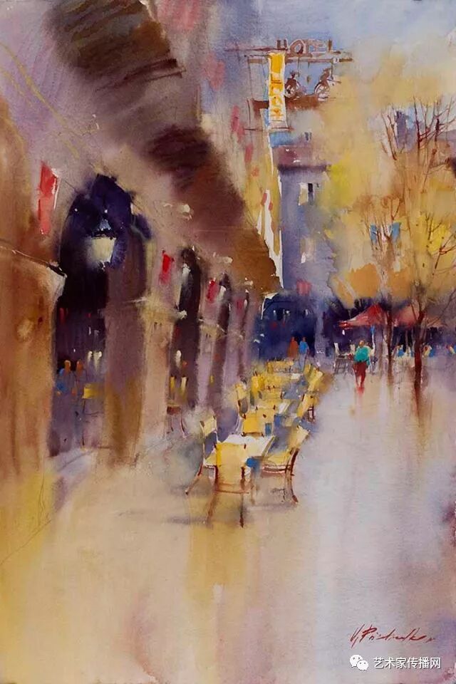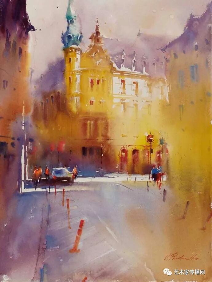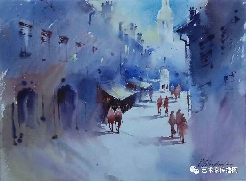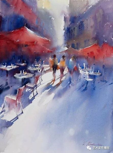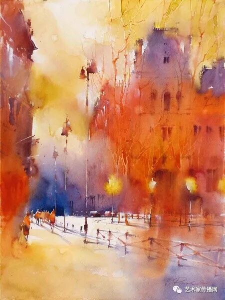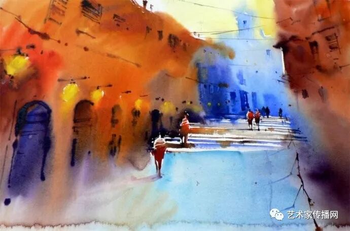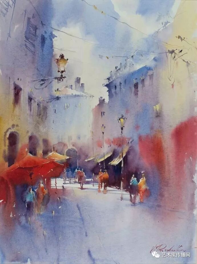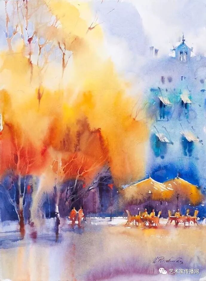 運用美麗而幹淨的色彩及明亮的色調將色相中的對比關係表現的淋漓盡致。維多利亞的《秋韻》、《老街風情》等作品便是一幅將對比色表現到極致的佳品,畫麵中大量運用了黃色與紫色,藍色與橙色的互補關係,冷暖關係及色彩純度,在模糊、清晰與隱約間徘徊,鮮活生動並帶來了熱烈的空間感受,“當眼睛看到一種色彩時,便會立即行動起來,它的本性就是必然地和無意識地立即產生另一種色彩,這種色彩同原來看到的那種色彩一起完成色輪的總和。”