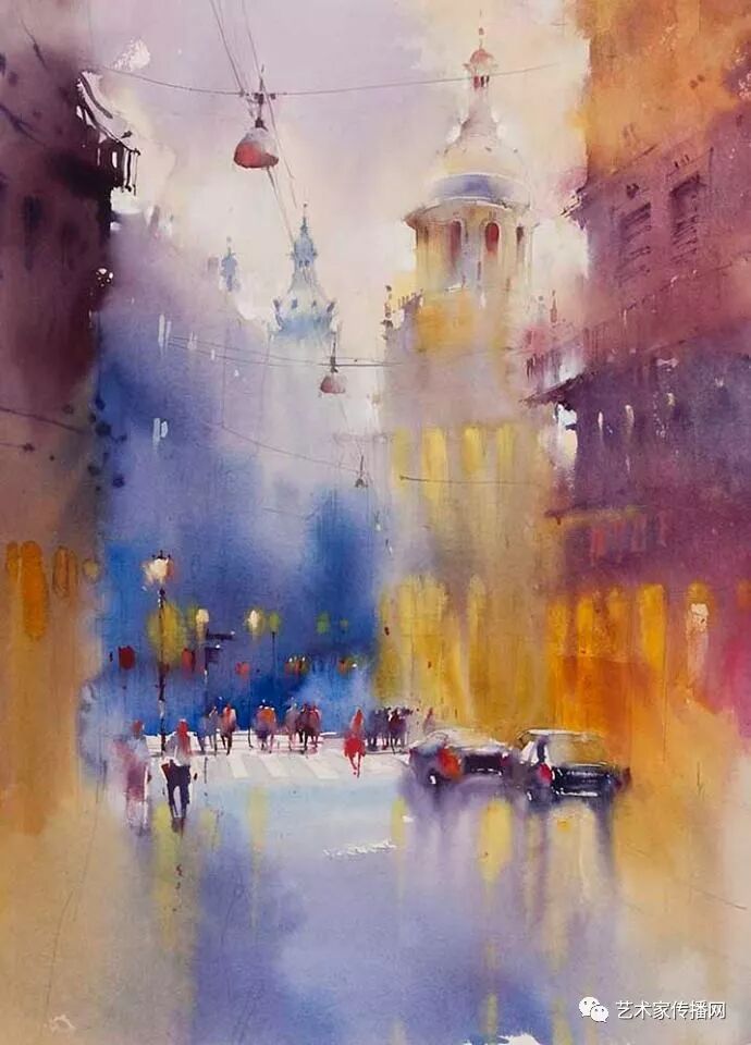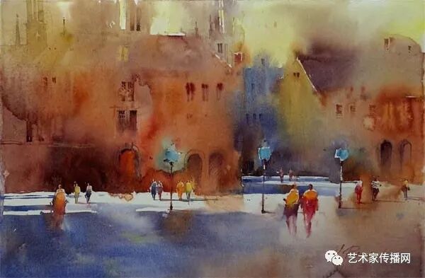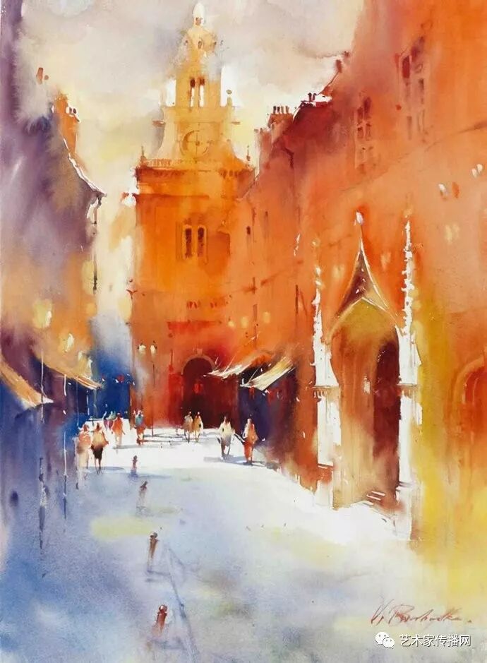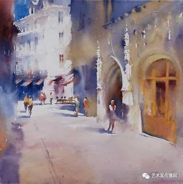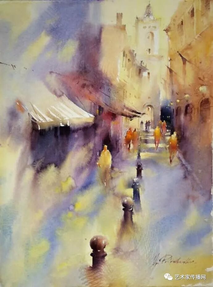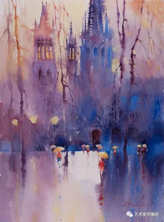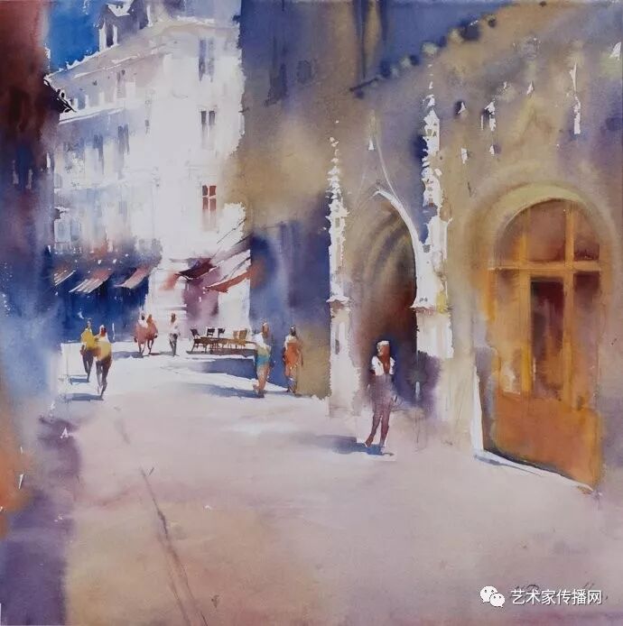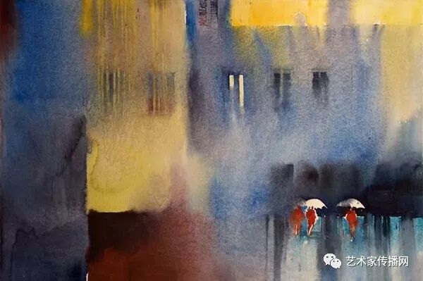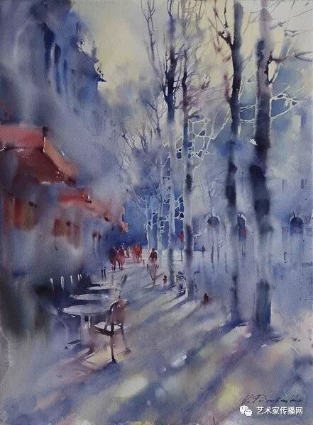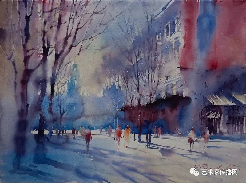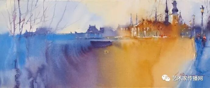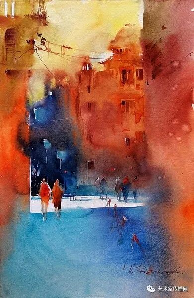 運用美麗而幹淨的色彩及明亮的色調將色相中的對比關係表現的淋漓盡致。維多利亞的《秋韻》、《老街風情》等作品便是一幅將對比色表現到極致的佳品,畫麵中大量運用了黃色與紫色,藍色與橙色的互補關係,冷暖關係及色彩純度,在模糊、清晰與隱約間徘徊,鮮活生動並帶來了熱烈的空間感受,“當眼睛看到一種色彩時,便會立即行動起來,它的本性就是必然地和無意識地立即產生另一種色彩,這種色彩同原來看到的那種色彩一起完成色輪的總和。”