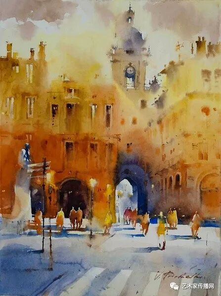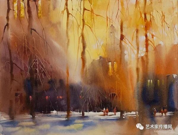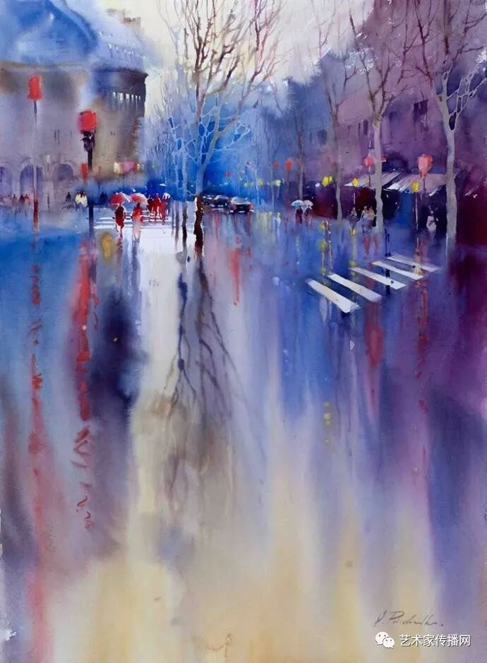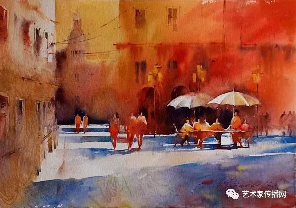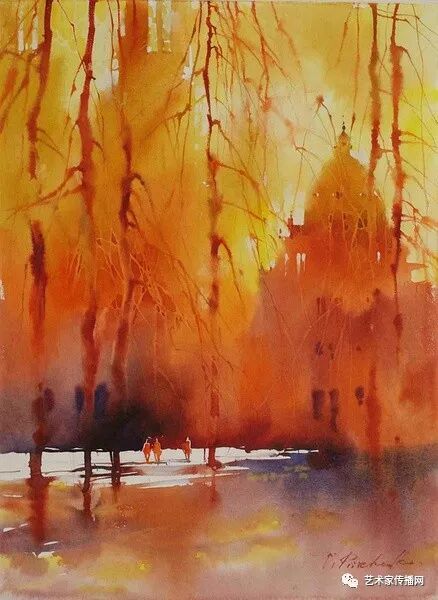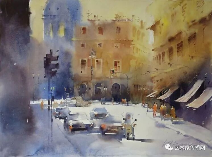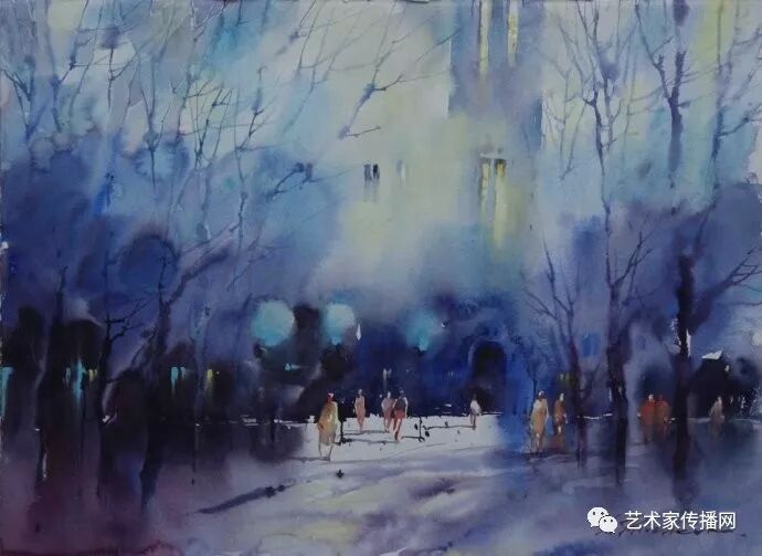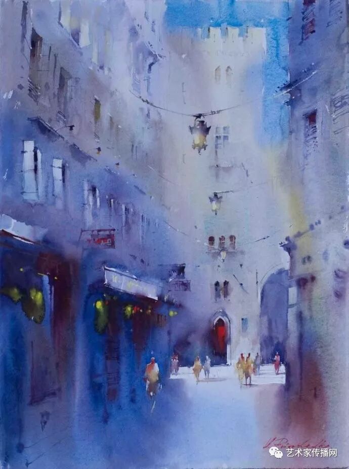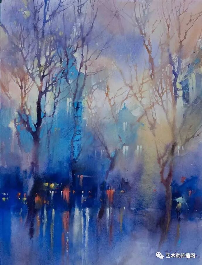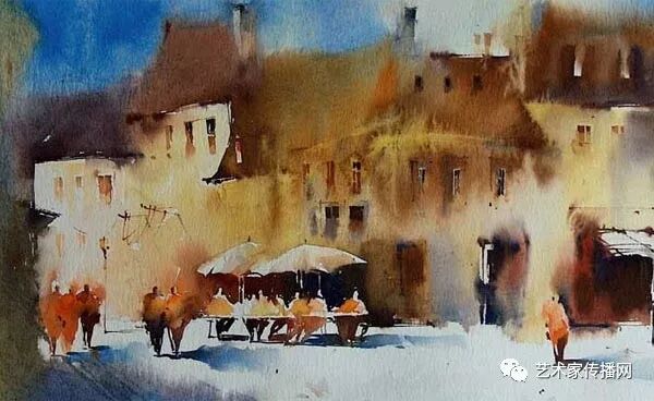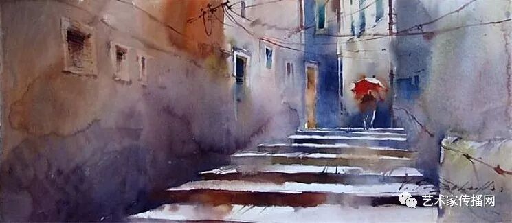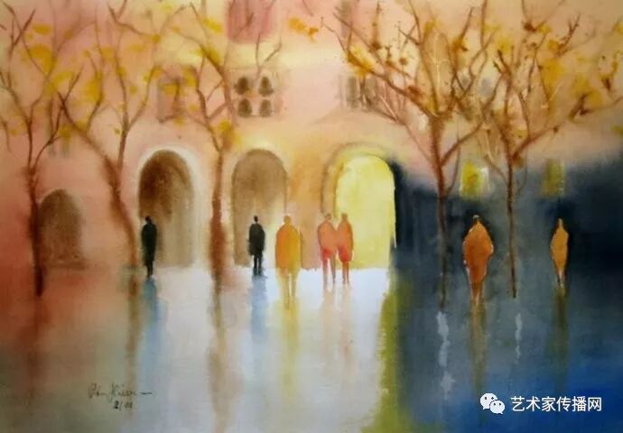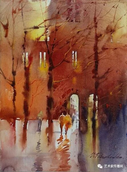 運用美麗而幹淨的色彩及明亮的色調將色相中的對比關係表現的淋漓盡致。維多利亞的《秋韻》、《老街風情》等作品便是一幅將對比色表現到極致的佳品,畫麵中大量運用了黃色與紫色,藍色與橙色的互補關係,冷暖關係及色彩純度,在模糊、清晰與隱約間徘徊,鮮活生動並帶來了熱烈的空間感受,“當眼睛看到一種色彩時,便會立即行動起來,它的本性就是必然地和無意識地立即產生另一種色彩,這種色彩同原來看到的那種色彩一起完成色輪的總和。”
