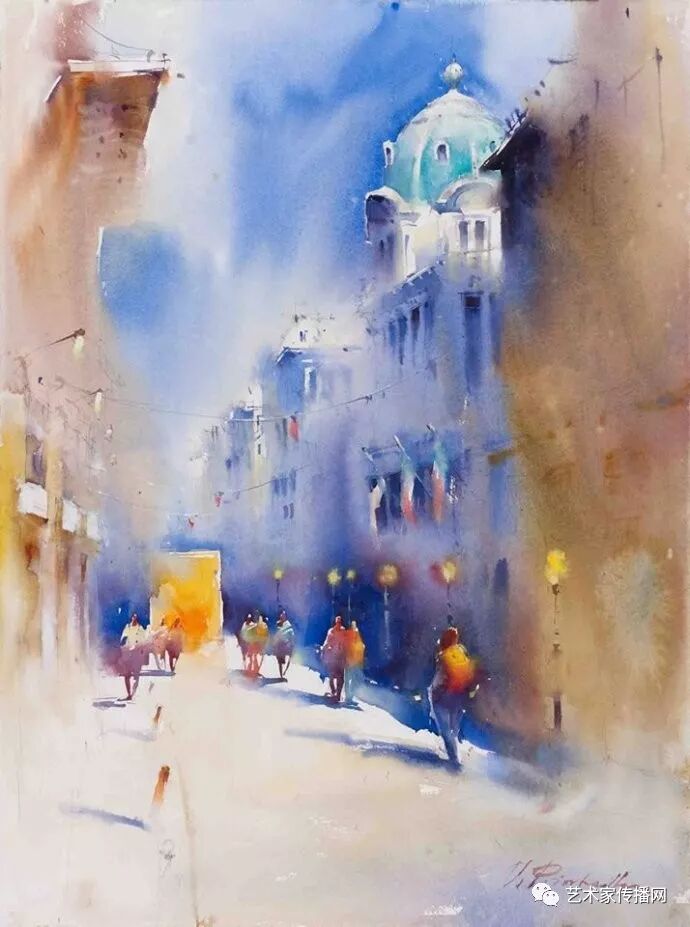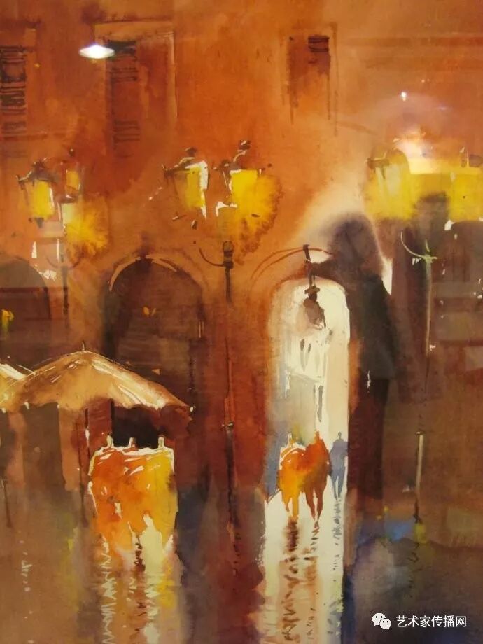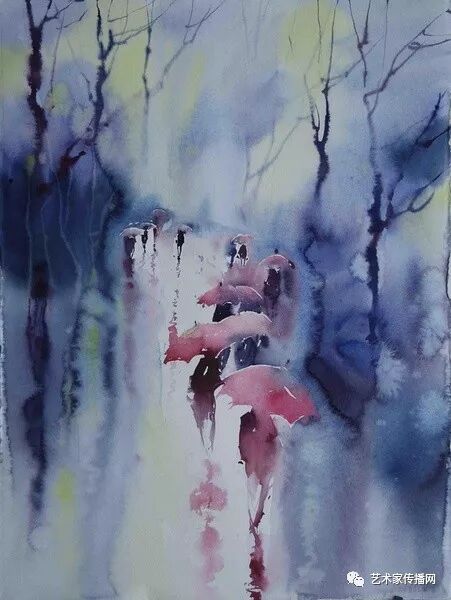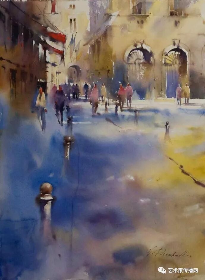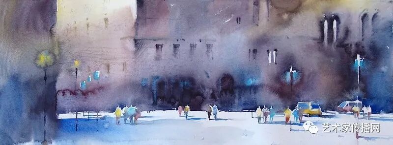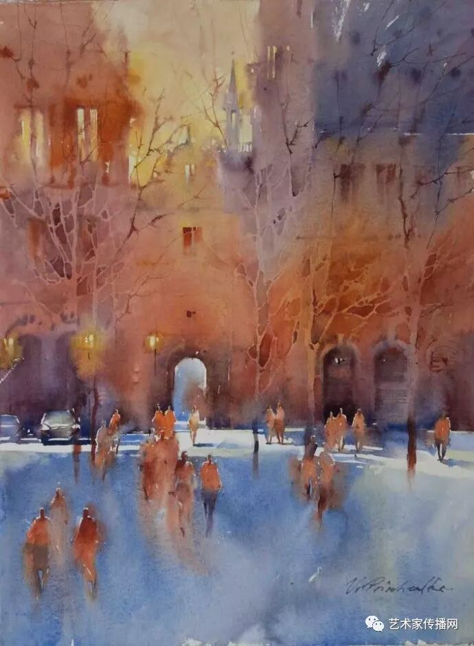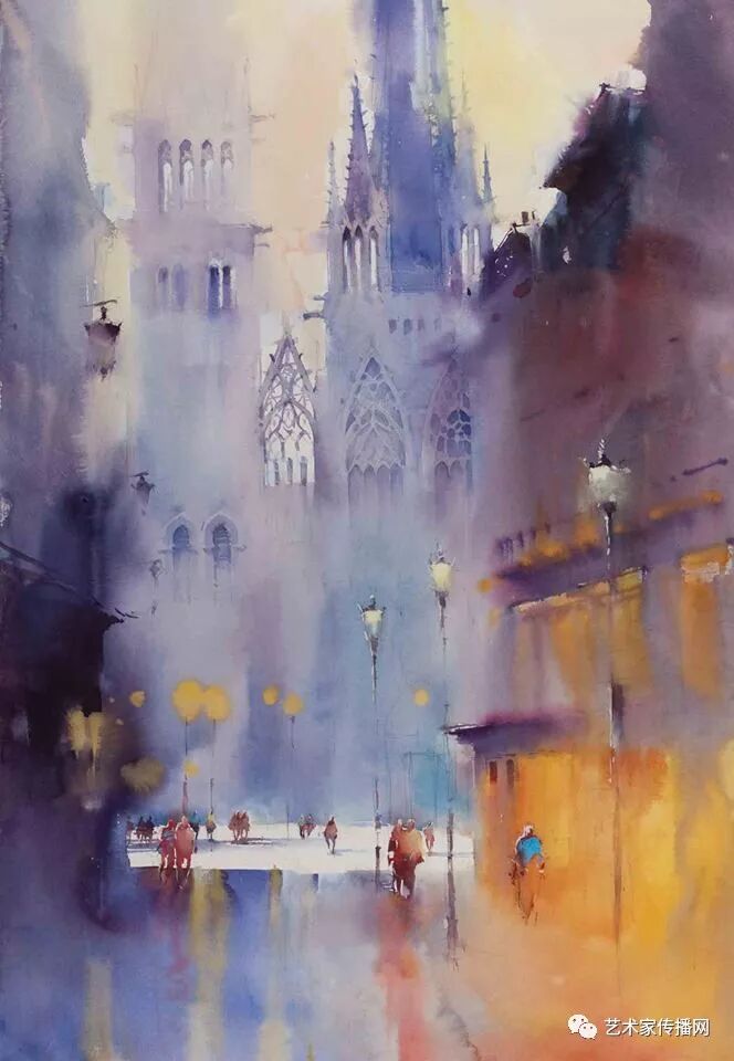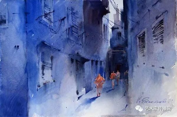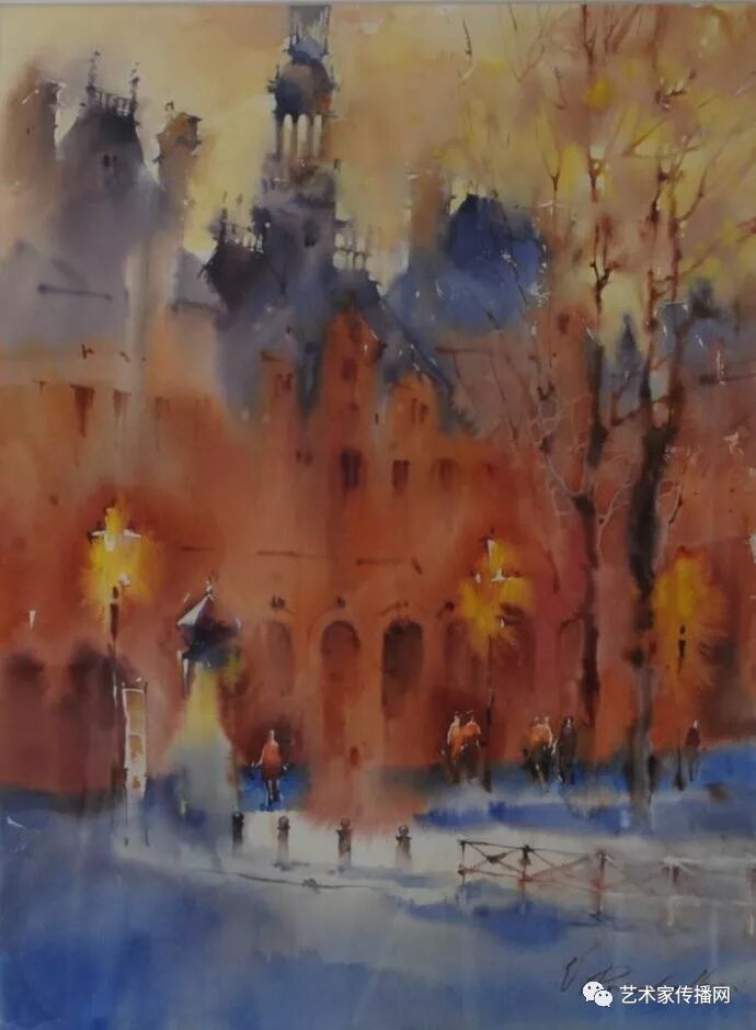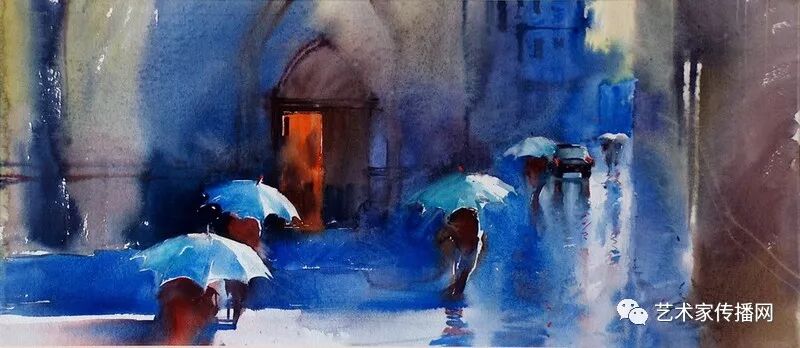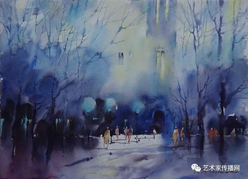 運用美麗而幹淨的色彩及明亮的色調將色相中的對比關係表現的淋漓盡致。維多利亞的《秋韻》、《老街風情》等作品便是一幅將對比色表現到極致的佳品,畫麵中大量運用了黃色與紫色,藍色與橙色的互補關係,冷暖關係及色彩純度,在模糊、清晰與隱約間徘徊,鮮活生動並帶來了熱烈的空間感受,“當眼睛看到一種色彩時,便會立即行動起來,它的本性就是必然地和無意識地立即產生另一種色彩,這種色彩同原來看到的那種色彩一起完成色輪的總和。”