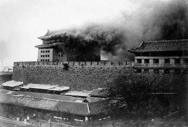 1900年9月,八國聯軍攻占北京後,一座箭樓正在燃燒。
