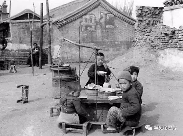 1940年代,北京胡同,圍坐在小吃挑周圍吃小吃的孩子。
