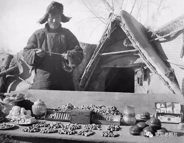 北京,賣糖果、花生、柿子、香煙的老人。照片大約拍攝於1930-1940年代。