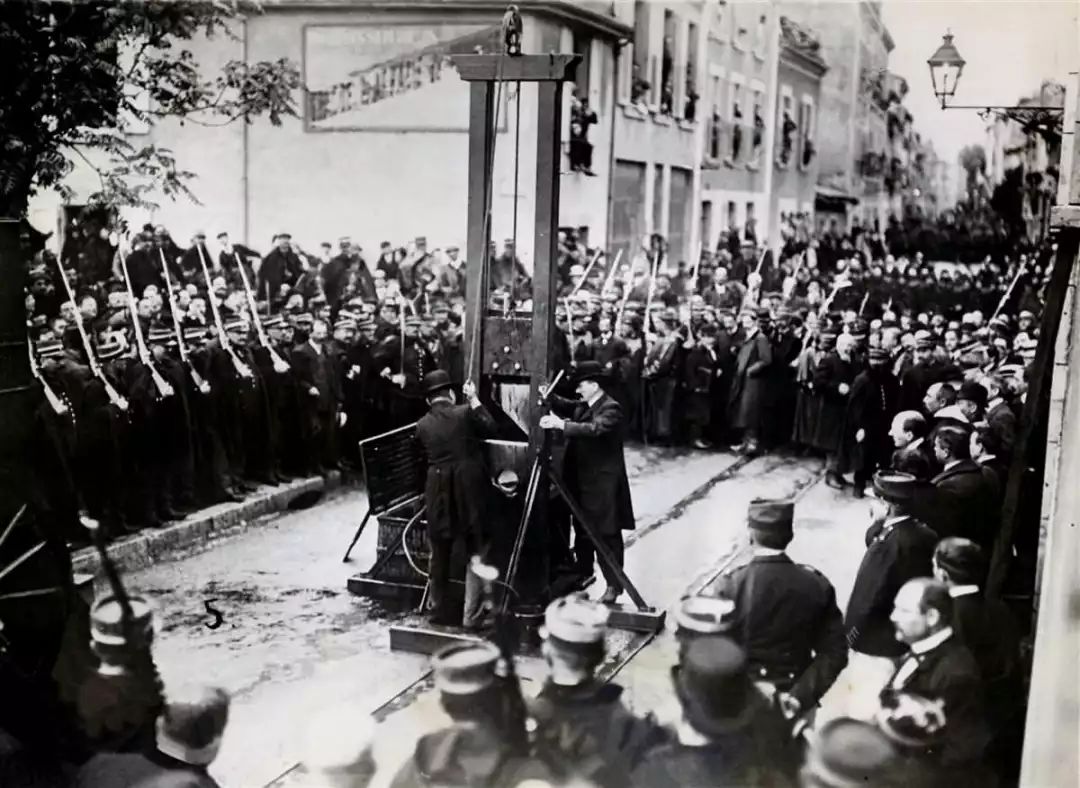 1909年,法國的一個斷頭台。即使是黑白照片,也可以看到刀片上的血跡。