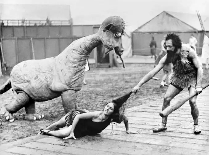 1930年,在英國利物浦,演員們在表演主題為“穴居人的交配”的一場戲。