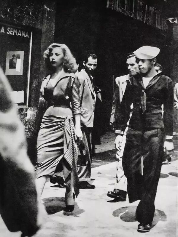 1950年,墨西哥的墨西哥城,一位時尚女性受到男性的圍觀和(語言)騷擾。這位女性至少被拍到有5張類似的照片。