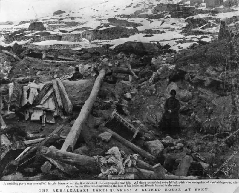 1900年,在阿塞拜疆巴庫發生了一場大地震,當時正在舉行婚禮的一座房子坍塌,右邊站著的人是新郎,也是那場婚禮的唯一幸存者。