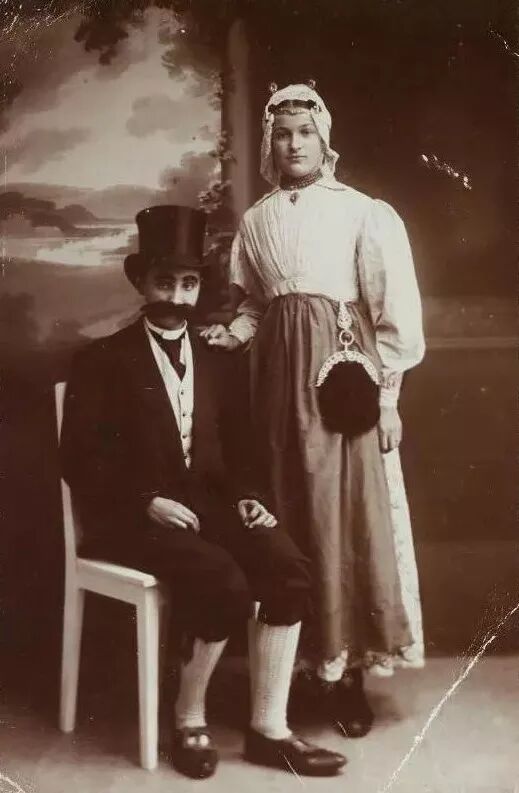 1905年在荷蘭,一對夫婦互換衣服,為了額外的樂趣而擺姿勢拍照。