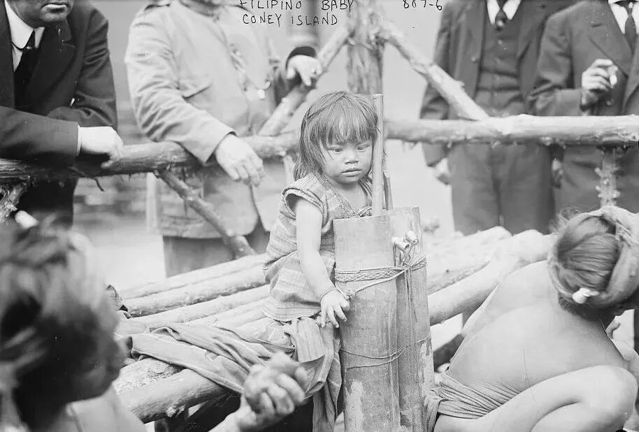 1906年,一名菲律賓小孩和她的家人在美國紐約市的"人類動物園"內,這裏專門展出那些"奇特的異國人類"。
