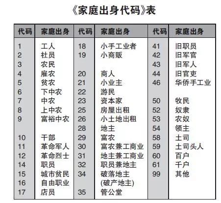 換言之,這45個代碼所指代的45類“家庭出身”,隻是最基本的劃分;或者說,它們是全國範圍內各式各樣“家庭出身”名稱的“交集”。