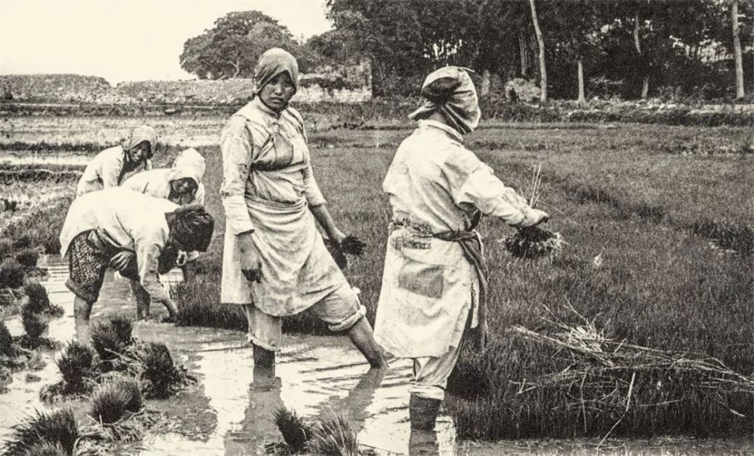 她們從秧田中拔出秧苗,紮成捆,帶到水田中,開始插秧。
