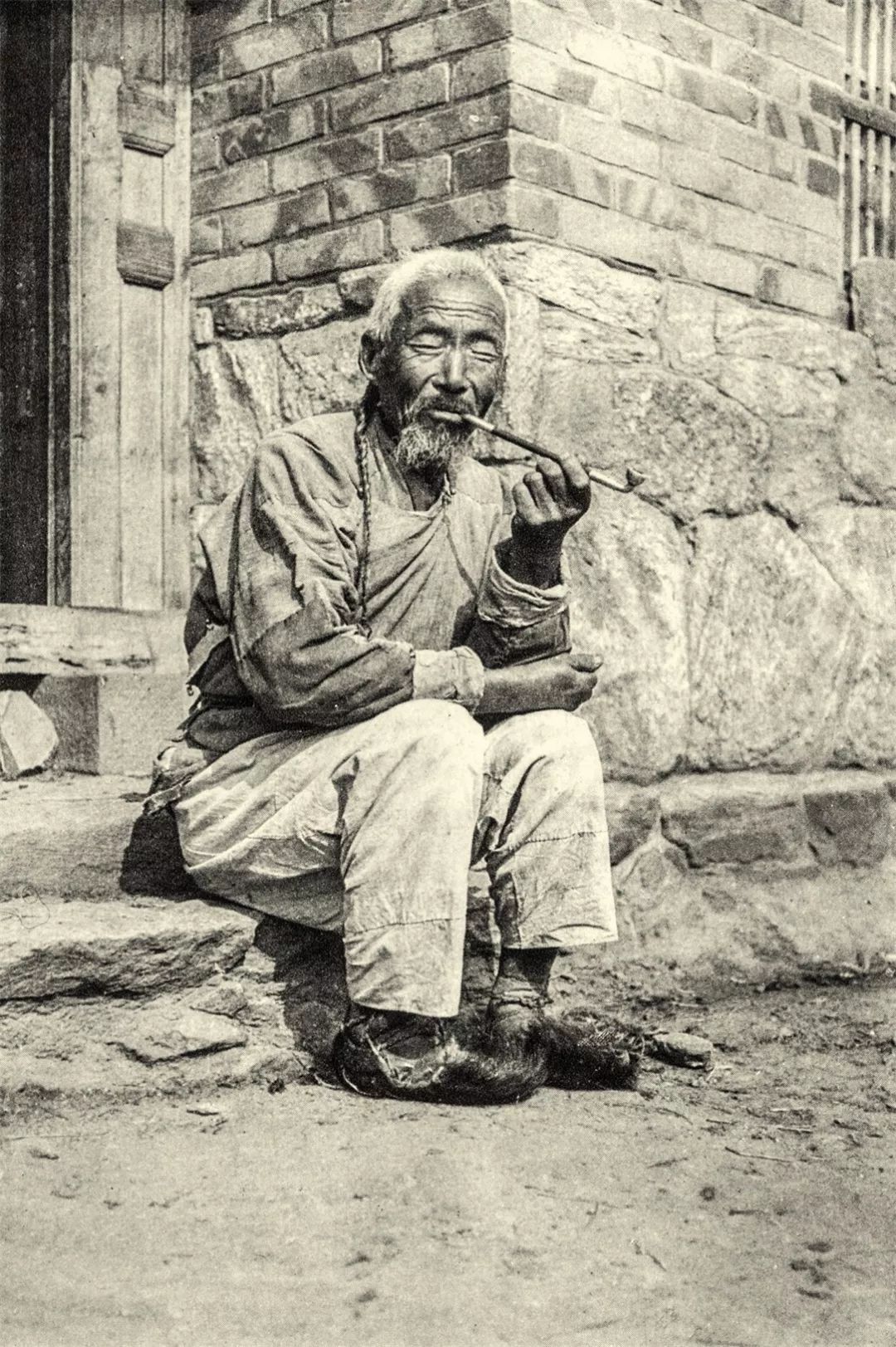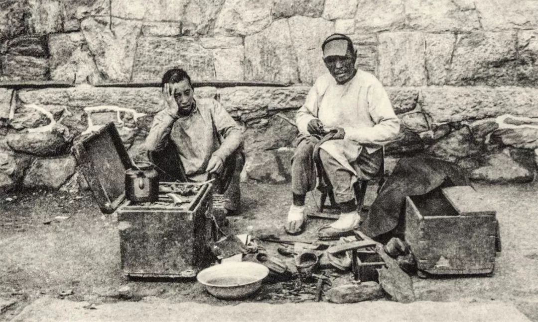 脫掉鞋子,補鞋匠很快就能把鞋修好。為了節省成本,補鞋匠把補鞋用的線放在水裏浸濕,而不是打蠟,這正是照片前方水盆的用途。補鞋匠的額頭上用辮子固定著一塊紙片,用來遮擋光線,避免眼睛受到強光刺激。