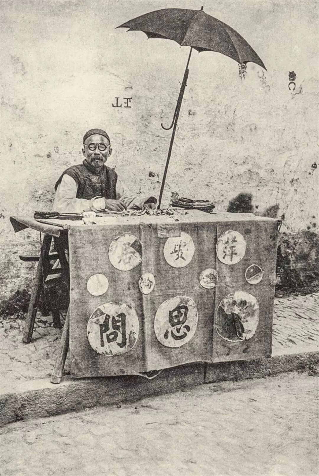 照片中的算命先生把卦攤擺在熱鬧的大街上。他讓顧客寫個漢字,通過拆解分析這個字的構造,測算他們的未來。