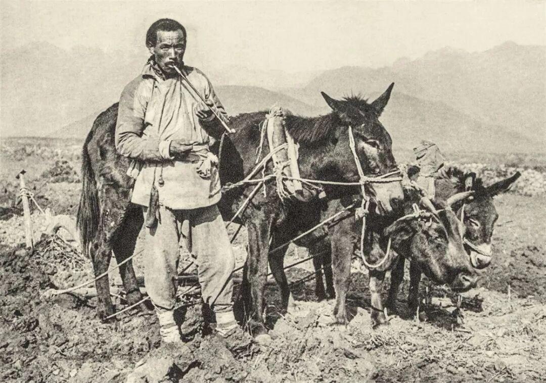 名副其實的混合部隊:有騾子,有牛,還有驢子。犁完一趟,主人休息一會兒,抽口煙。