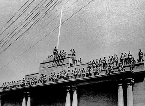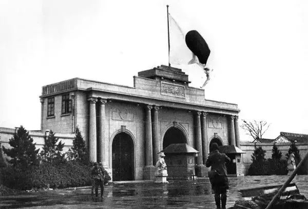 1937年12月,日軍在南京國民政府門樓上插上太陽旗。