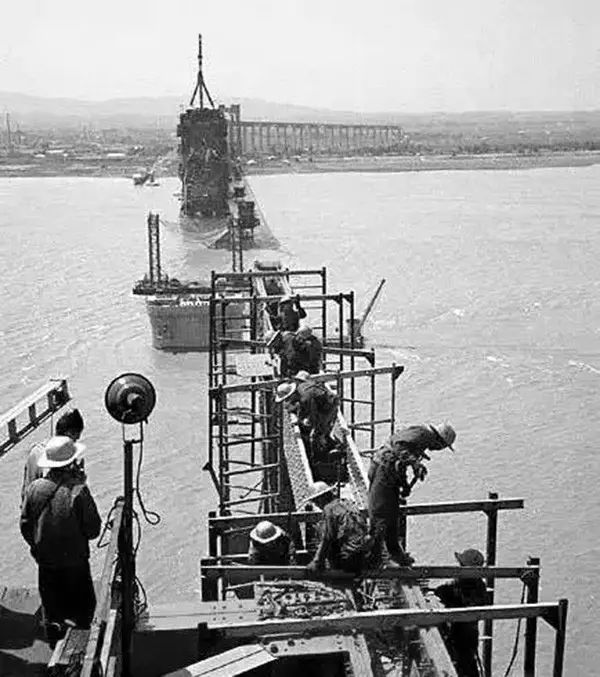 1967年,建設南京長江大橋的工人在高空架設鋼梁。