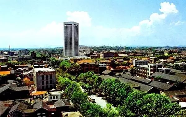 1983年夏,從中山東路方向遠眺新街口新建的金陵飯店。金陵飯店於1983年5月份落成。