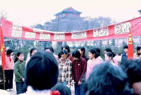 1980年代,南京,鼓樓廣場前,文明禮貌宣傳站。