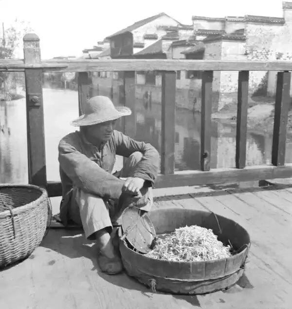 民國時期,南京城南,秦淮河某橋上賣豆芽的菜販。