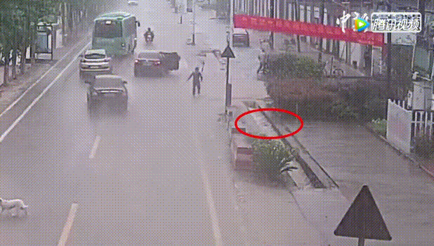 危急關頭,駕車路過的徐衛華一家挺身而出,緊急停車,冒著大雨與湍急的水流賽跑,從馬路這邊追到了馬路對麵。