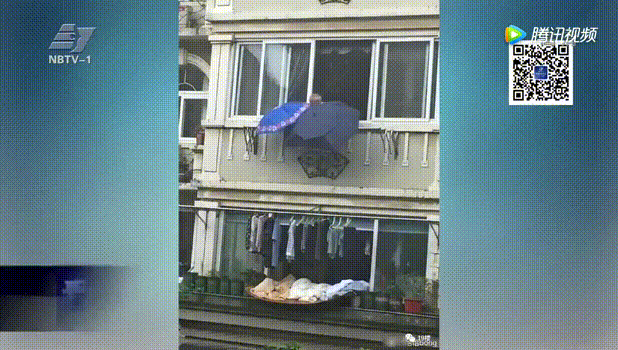 這也是一個發生在窗戶處的故事。不同的是這次是救衣服,大雨滂沱衣物被淋,樓上77歲的胡爺爺從自家窗戶裏撐起兩把傘,在雨中為樓下住戶的衣服和被子擋雨,一直到鄰居回來收完衣物才離開。
