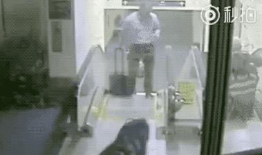 一位乘輪椅的老人,誤把自動扶梯當電梯。旁邊的大叔完全顧不得手中的行李了,立刻衝上去援助。