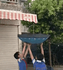 一隻小貓被困在屋頂,徘徊不前,遲遲不敢下來。兩個剛放學的小男孩看見後,馬上撐開手裏的傘接著。