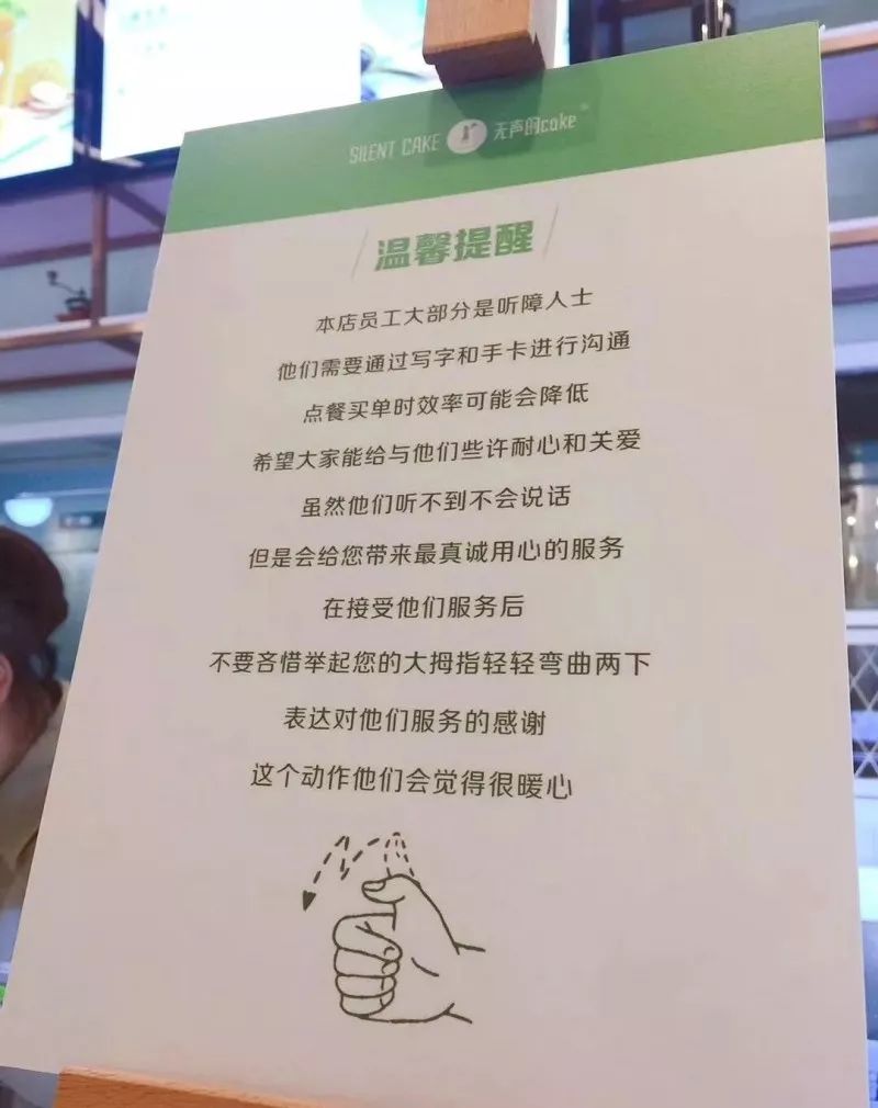 無聲的cake是專門招收聽障員工的烘焙店,他們聽不到,都是用紙筆和顧客交流,不時做出“OK”的手勢,結賬後,客人彎彎拇指表示“謝謝”,一切盡在不言中。