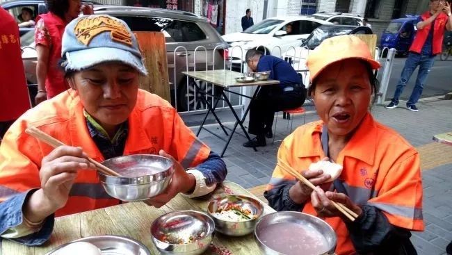 幹了近10年環衛工,5月4日早上,57歲的李師傅頭一次吃到熱乎乎的早飯。小米粥,熱饅頭,外加幾個爽口小菜。雖算不上豐盛,但讓人打心眼裏覺得溫暖。為他們提供這頓早飯的,是一家叫“免費愛心粥”的小店,愛心粥屋為弱勢群體提供免費早餐。