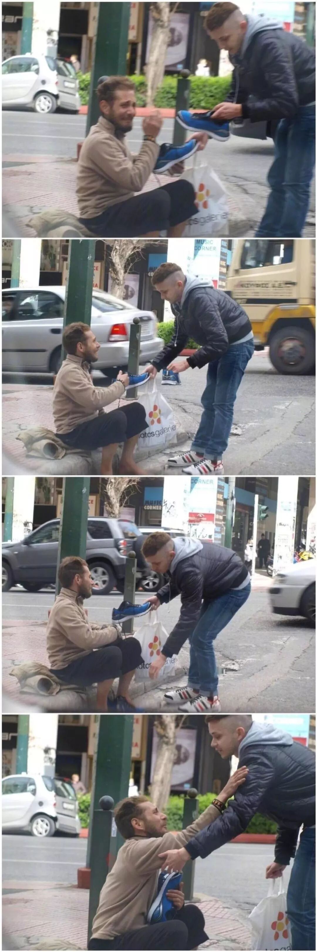 網友分享的街頭暖心一幕。一個陌生人看到流浪漢光著腳,就給他買了一雙鞋穿,流浪漢感動地哭到不能自已。