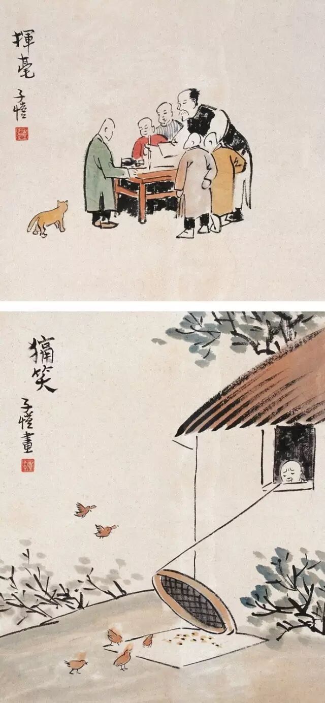 以上原都是過去的事,但是常常切在我的心頭,使我不能忘卻。現在,你已做中學生,不久就要完全脫離黃金時代而走向成人的世間去了。我覺得你此行比出嫁更重大。古人送女兒出嫁詩雲:“幼為長所育,兩別泣不休。對此結中腸,義往難複留。”你出黃金時代的“義往”,實比出嫁更“難複留”,我對此安得不“結中腸”?所以現在追述我的所感,寫這篇文章來送你。你此後的去處,就是我這冊畫集裏所描寫的世間。我對於你此行很不放心。因為這好比把你從慈愛的父母身旁遣嫁到惡姑的家裏去,正如前詩中說:“自小閨內訓,事姑貽我憂。”事姑取甚樣的態度,我難於代你決定。但希望你努力自愛,勿貽我憂而已。
