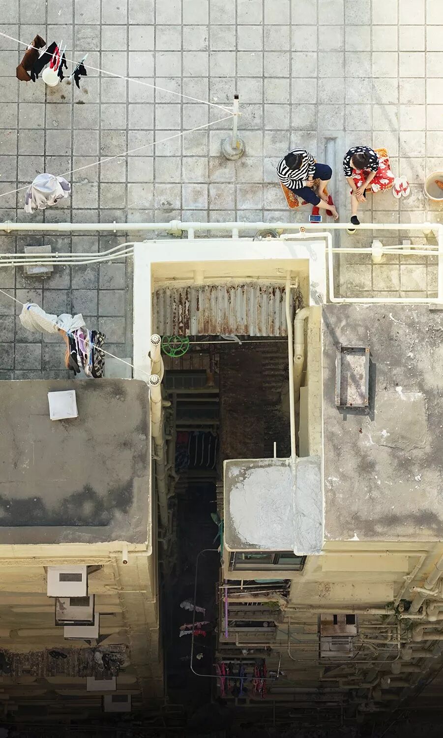 法國攝影師羅曼拍攝的最新係列作品始終將鏡頭對準香港城市“半空中”的各個屋頂與天台,收集香港居民日常生活中的一幕幕真實瞬間。他將這個係列命名為"混凝土之上"。