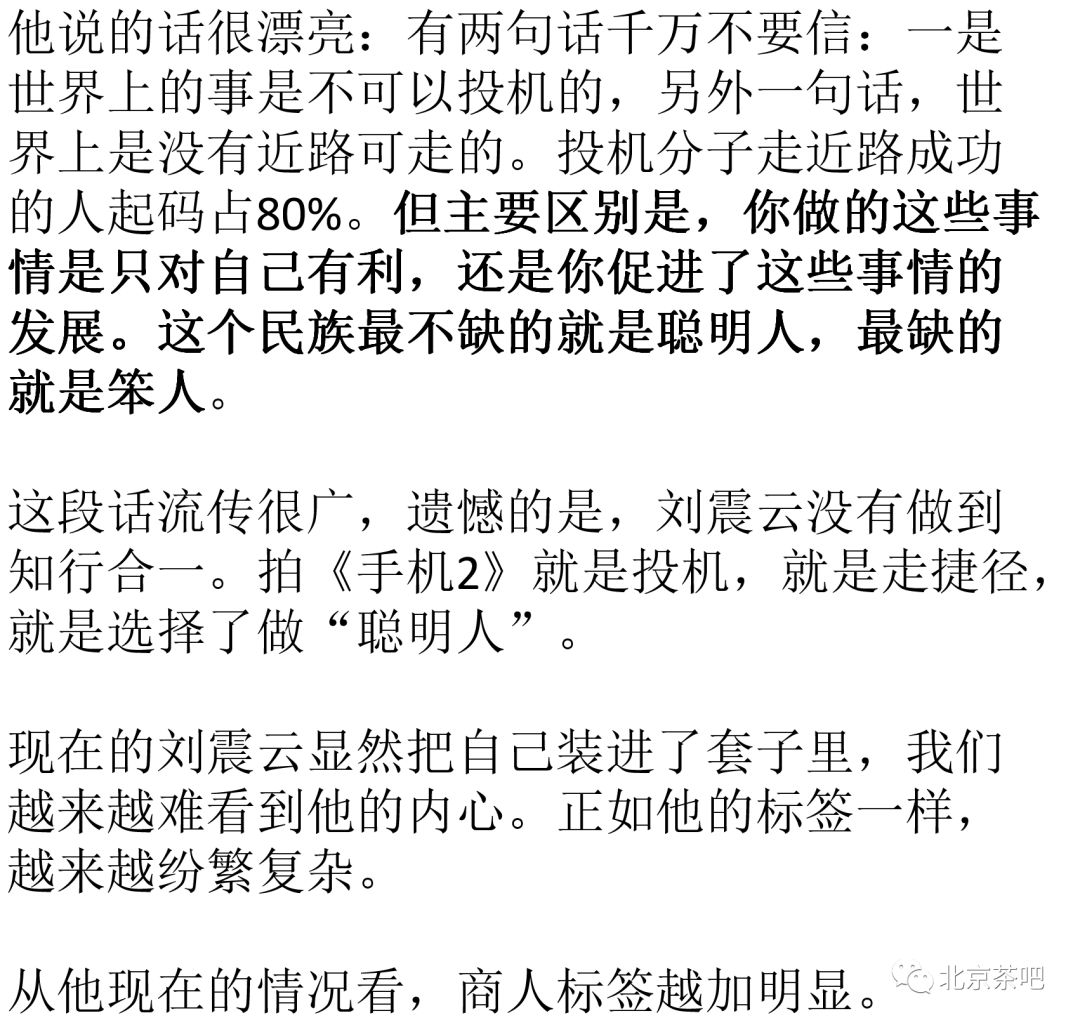 劉震雲的聰明之處就在於,他能把自己的實力換成金錢。可是,凡事皆有度,賺到錢就可以了,如果鑽到錢眼裏就不好了。