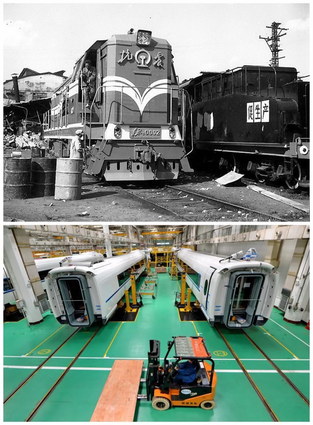 拚版照片:上圖:抗震號機車(資料圖片);下圖:2016年7月22日拍攝的中車唐山公司總裝車間一角(新華社記者 牟宇 攝)。