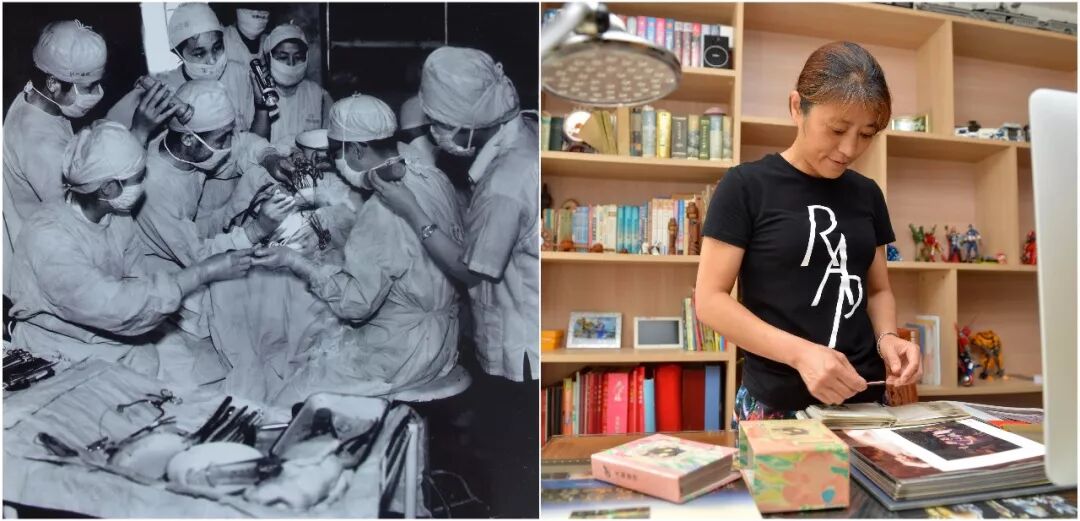 拚版照片:左圖為唐山大地震發生後,上海醫療隊在給傷員做手術(資料照片);右圖為2016年7月24日,“地震嬰兒”孫滬在家中整理老照片(新華社記者 牟宇 攝)。