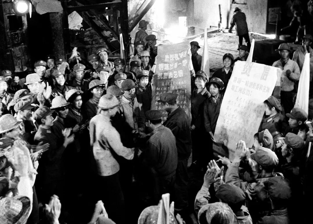 這是1976年唐山鋼鐵公司工人慶賀唐山大地震後煉出“誌氣鋼”的場景。(2015年2月25日)新華社發
