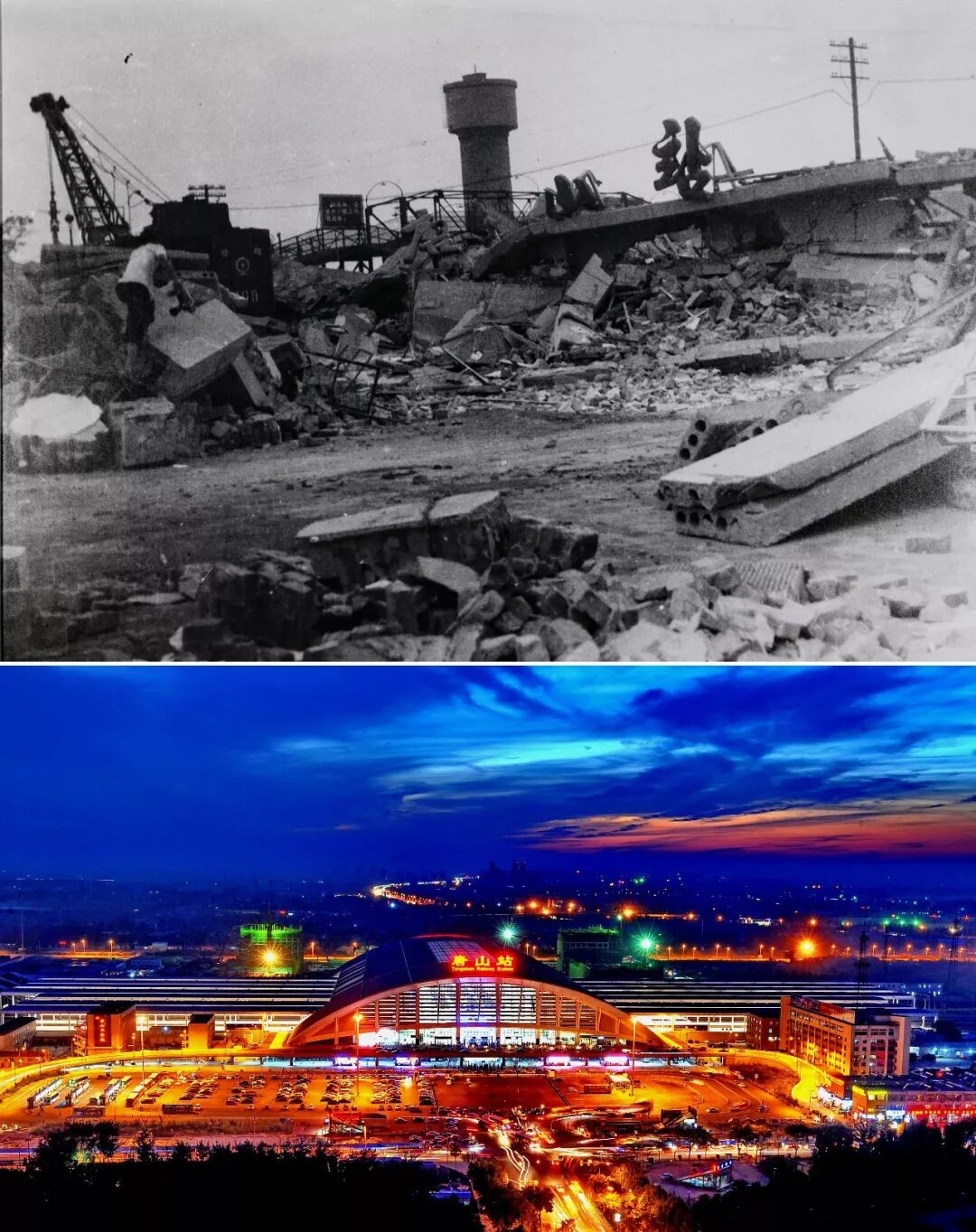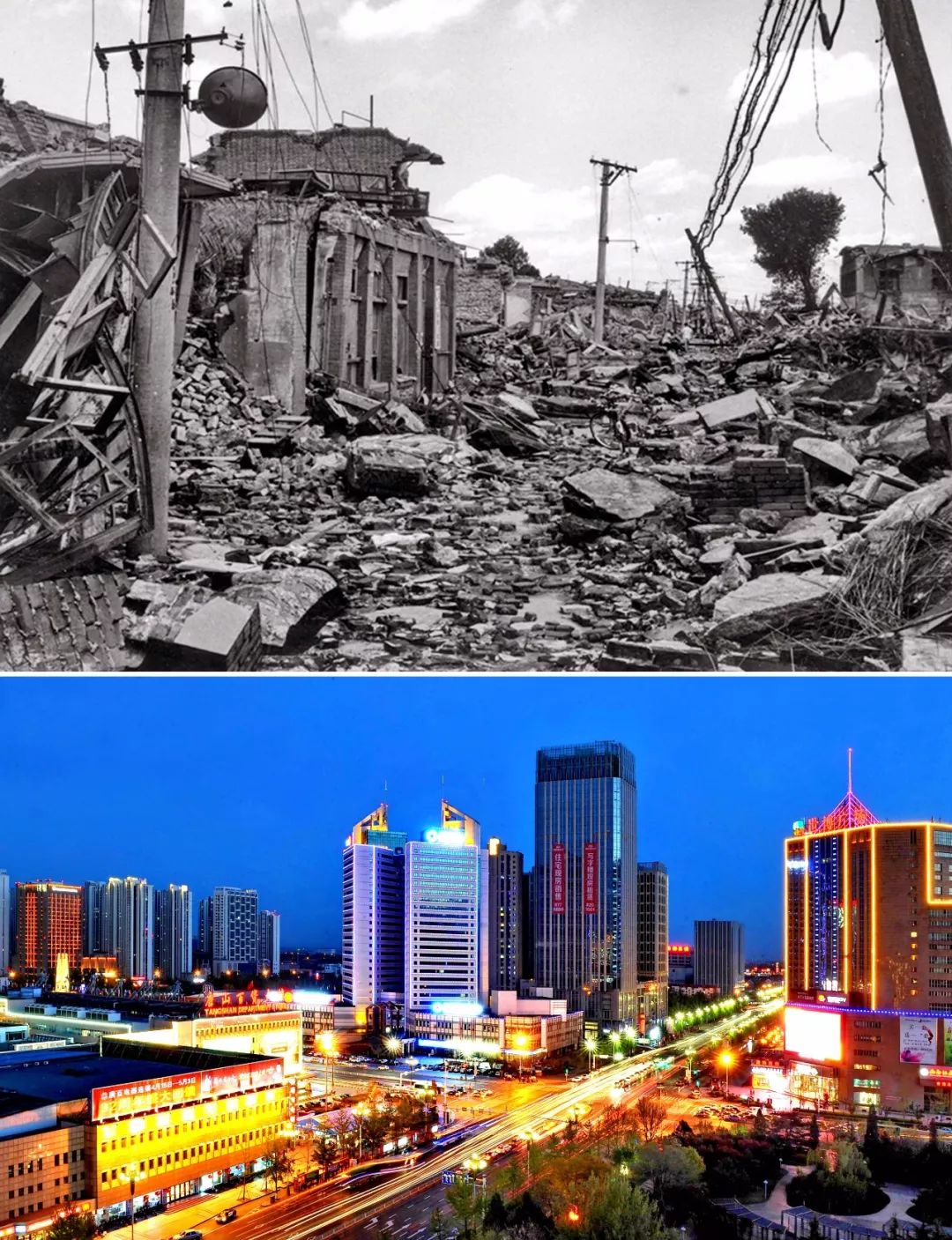 拚版照片:上圖為唐山市震後照片(資料照片)。下圖為2016年5月17日拍攝的唐山市夜景(新華社記者 楊世堯 攝)。
