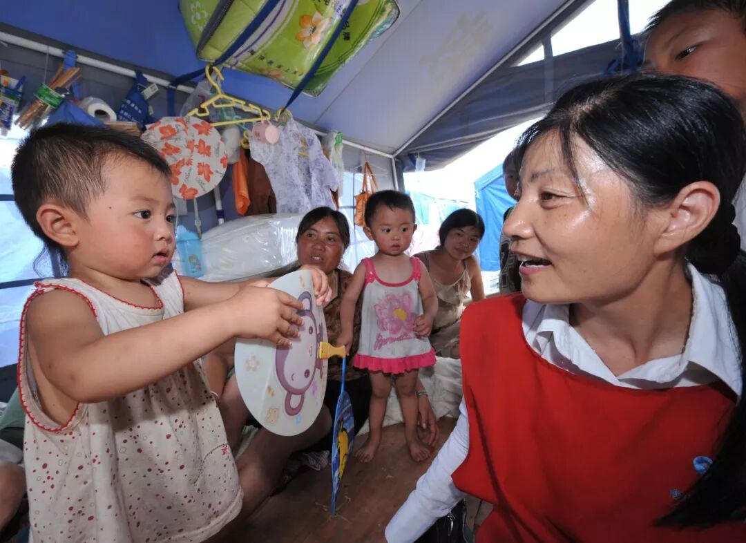 2008年6月10日,董惠娟(右)在為綿竹市一名小朋友進行心理疏導。新華社記者 楊俊江 攝