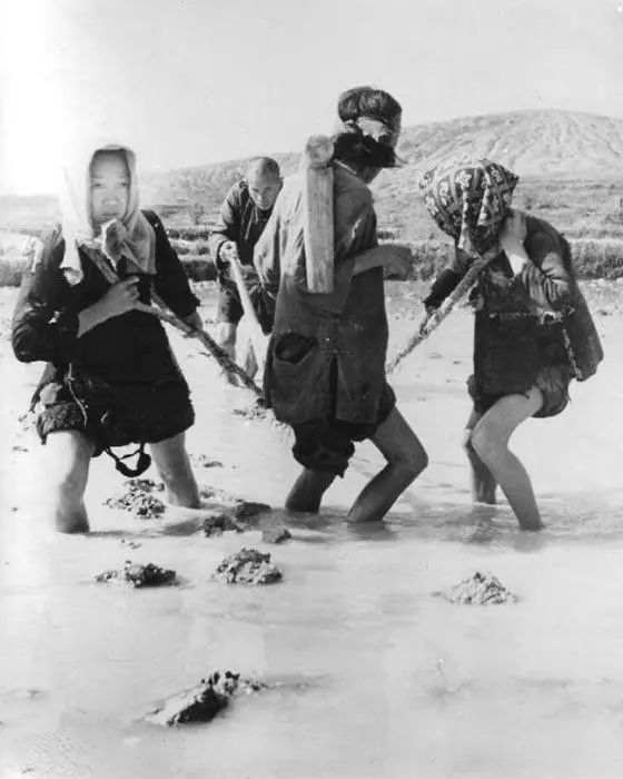 1946年,湖南,饑荒時期水田裏耕作的農夫。