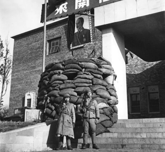 1946年3月12日,國軍進駐沈陽。圖為13日司令部前的衛兵。