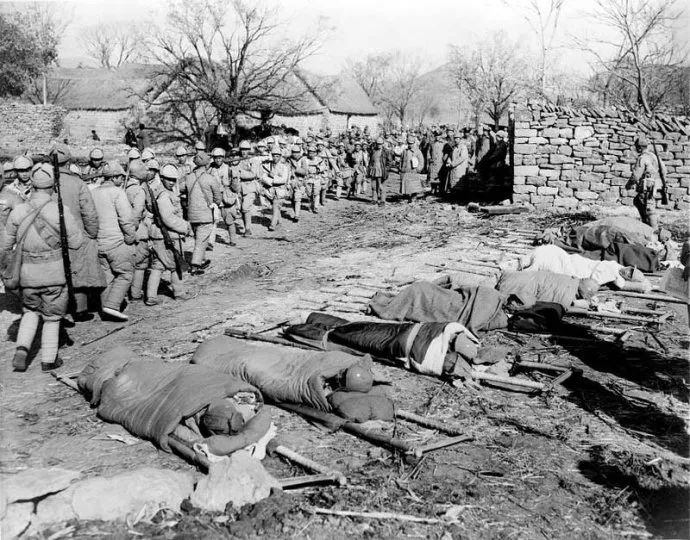 1948年12月,國軍開往蘇州前線,與後撤的受傷士兵相遇,躺在擔架上的是重傷員。