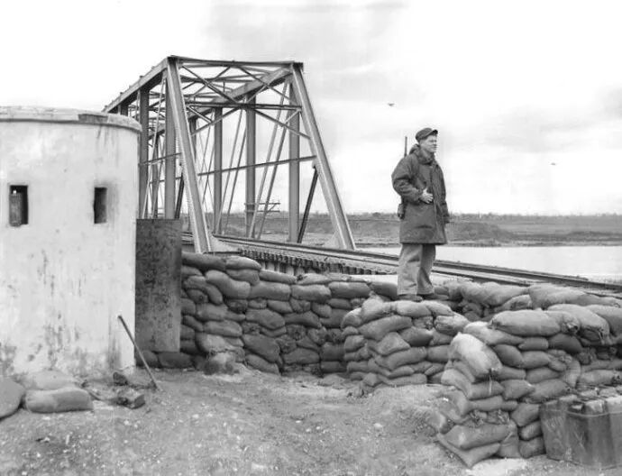 1946年,中國北方,守衛鐵路橋的美國兵。
