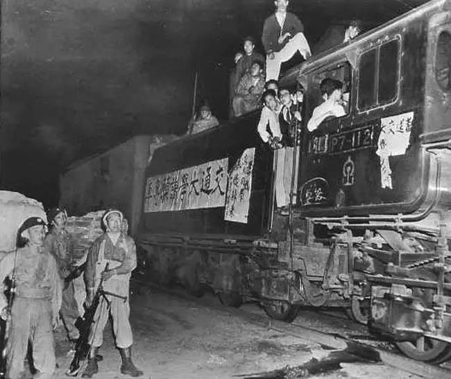 1949年4月,上海北站,開往杭州列車上的逃難人群。