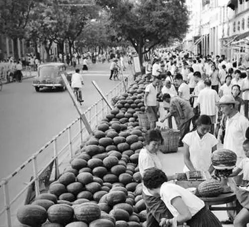 夏天在四季香果品店門前吃西瓜是王府井大街的一景。四季香果品店在百貨大樓對麵,北麵是碧春茶莊和王府井食品店,南麵是鍾表店和白底紅字十分醒目的北京照相館。高台階之上的果品店、茶莊和食品店相連,透過木框玻璃牆,店內景致盡收眼底。每年西瓜上市,果品店會在門前便道上放置一個長方形大果皮箱,箱子中間翻板扔西瓜皮,下麵坡槽吐瓜子,即方便顧客,也顧及了環境衛生。