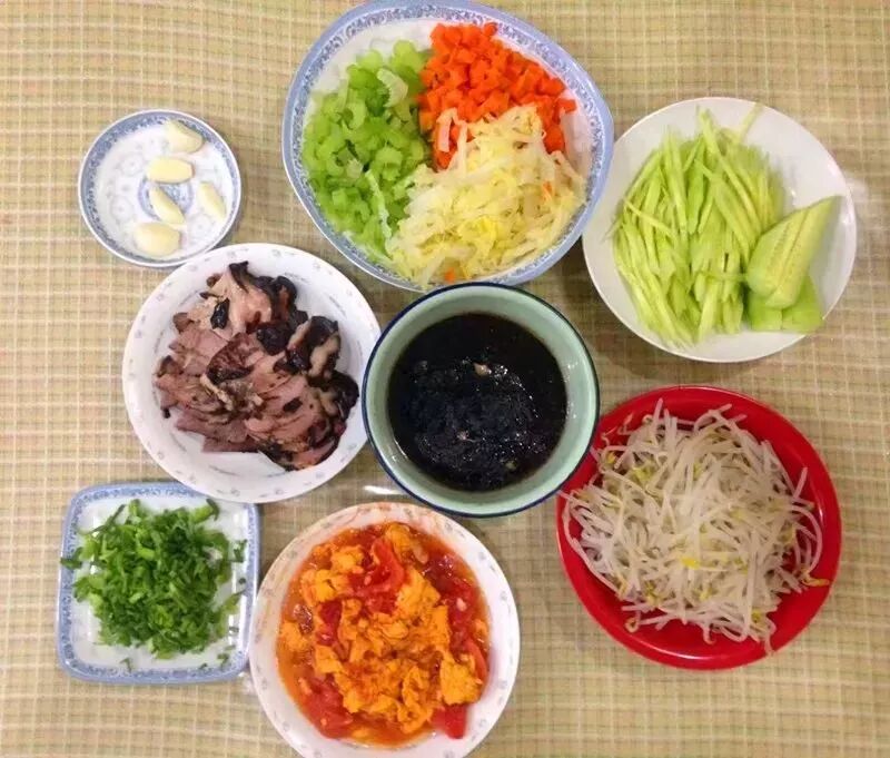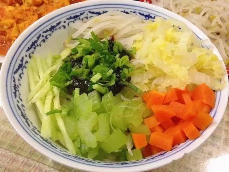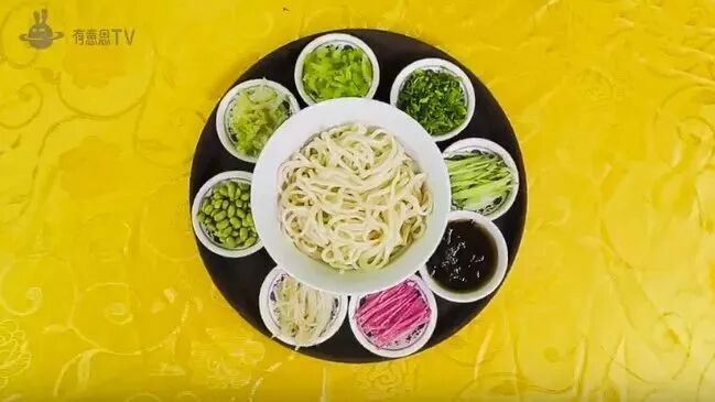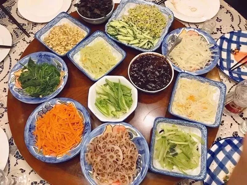 春天要吃豆芽菜、蘿卜纓兒和香椿芽兒;初夏配新蒜、黃瓜絲、韭菜段;秋天是胡蘿卜絲和芹菜末。冬天要吃心裏美水蘿卜絲,還有焯過的大白菜切絲。再來一勺臘八醋,嚼兩顆臘八蒜,這就快過年了。
