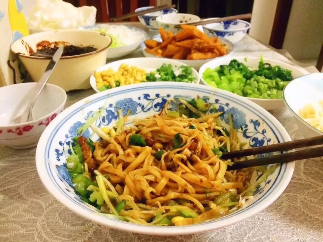 用肉丁炸成醬,一斤麵條全家管飽;鮮亮的菜碼往上麵一鋪,好歹算是模有樣的一份飯菜,也是風雨飄搖裏的慰藉和熨帖。