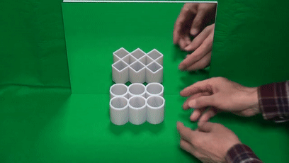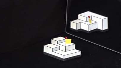 箭頭明明向左,鏡子裏卻向右。當你親手做完才知道,根本沒有什麽所謂的箭頭。隻是利用了特定的形變,讓你看到了箭頭的形狀。再利用鏡像達到神奇的效果。